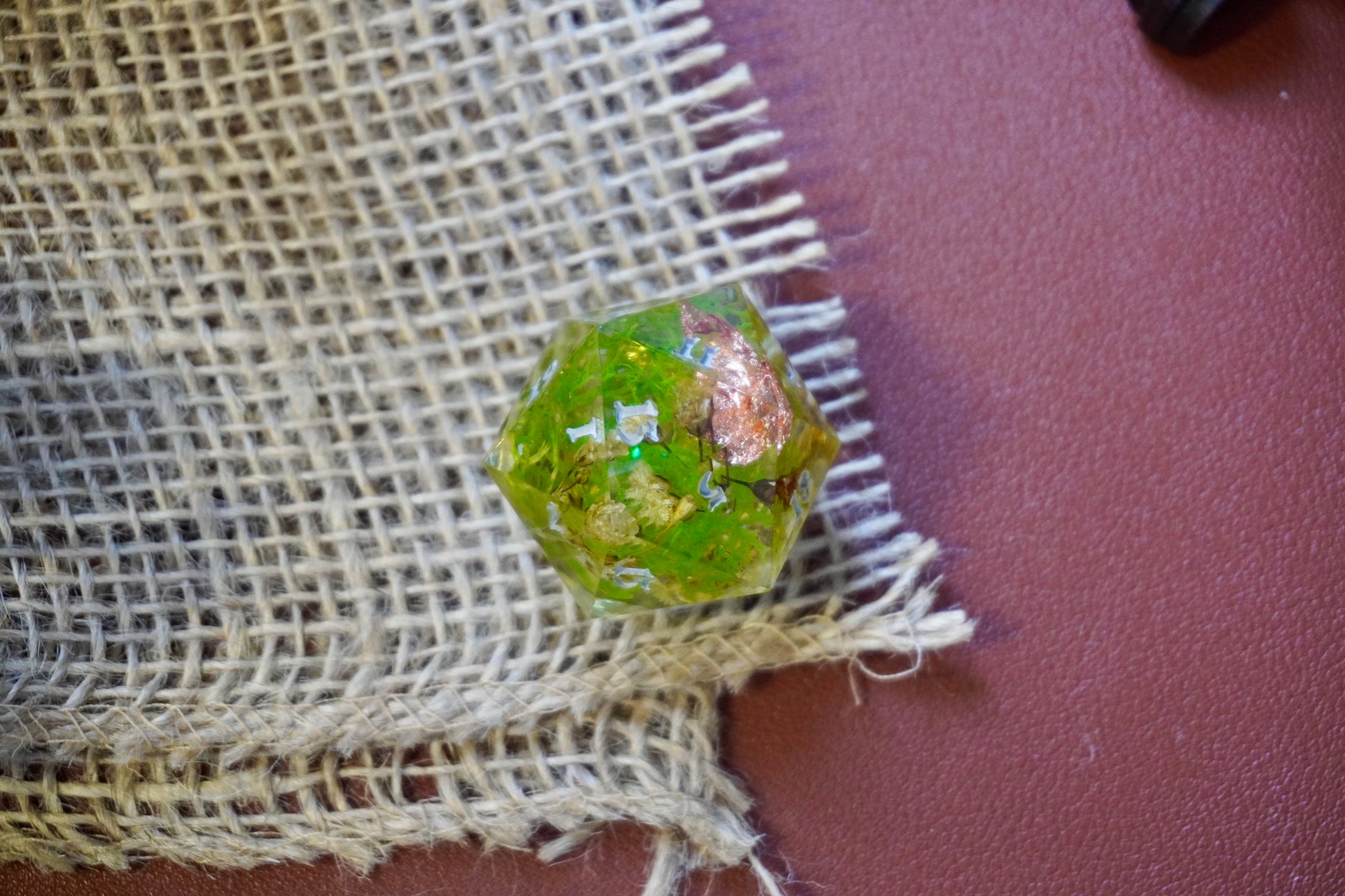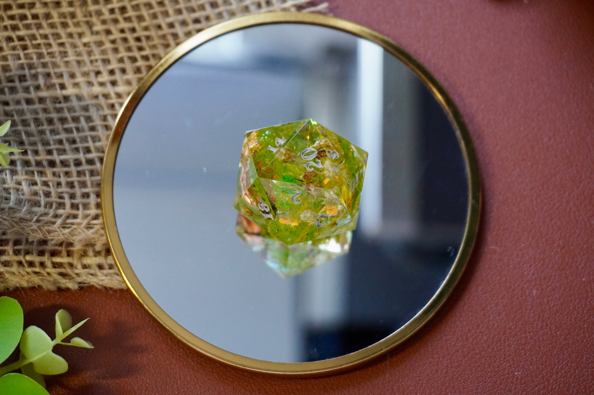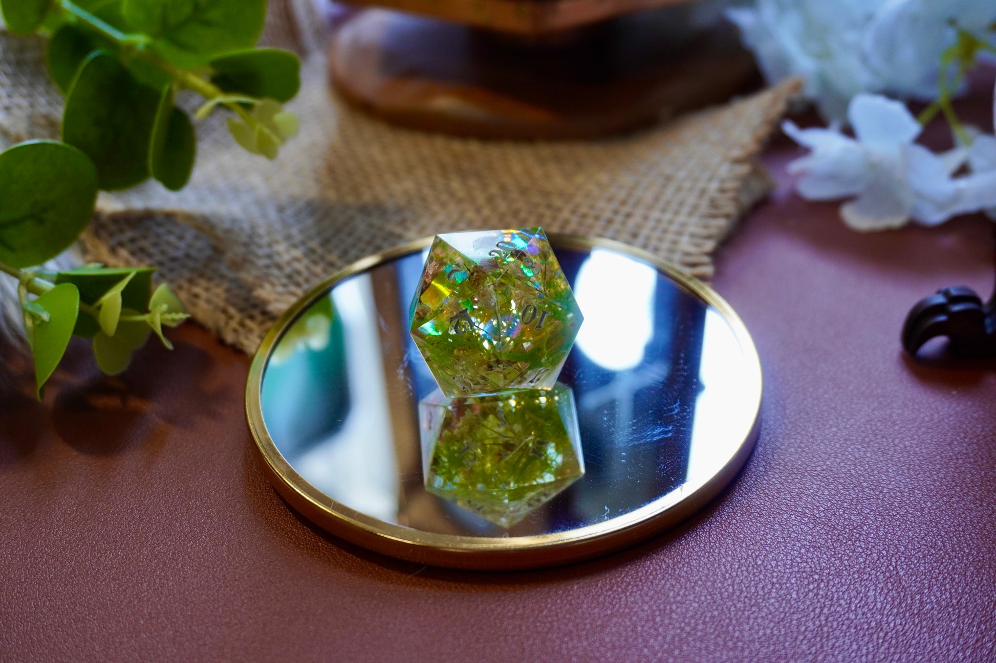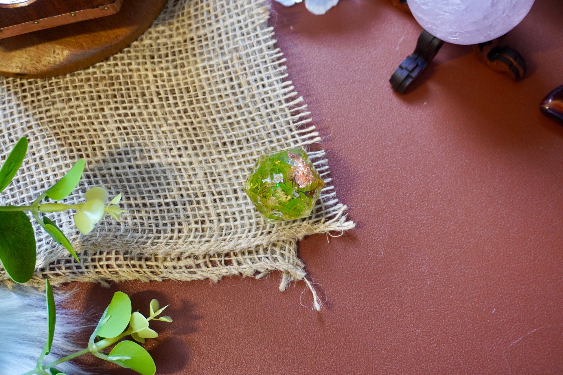 Deze prachtige, handgemaakte dobbelsteen is perfect voor liefhebbers van tabletop RPG’s, bordspellen en verzamelaars. Elk stuk is zorgvuldig gegoten, geschuurd en gepolijst voor een unieke en hoogwaardige afwerking. Gemaakt van hoogwaardig hars, iridescent folie, mos en gedroogde bloemen.