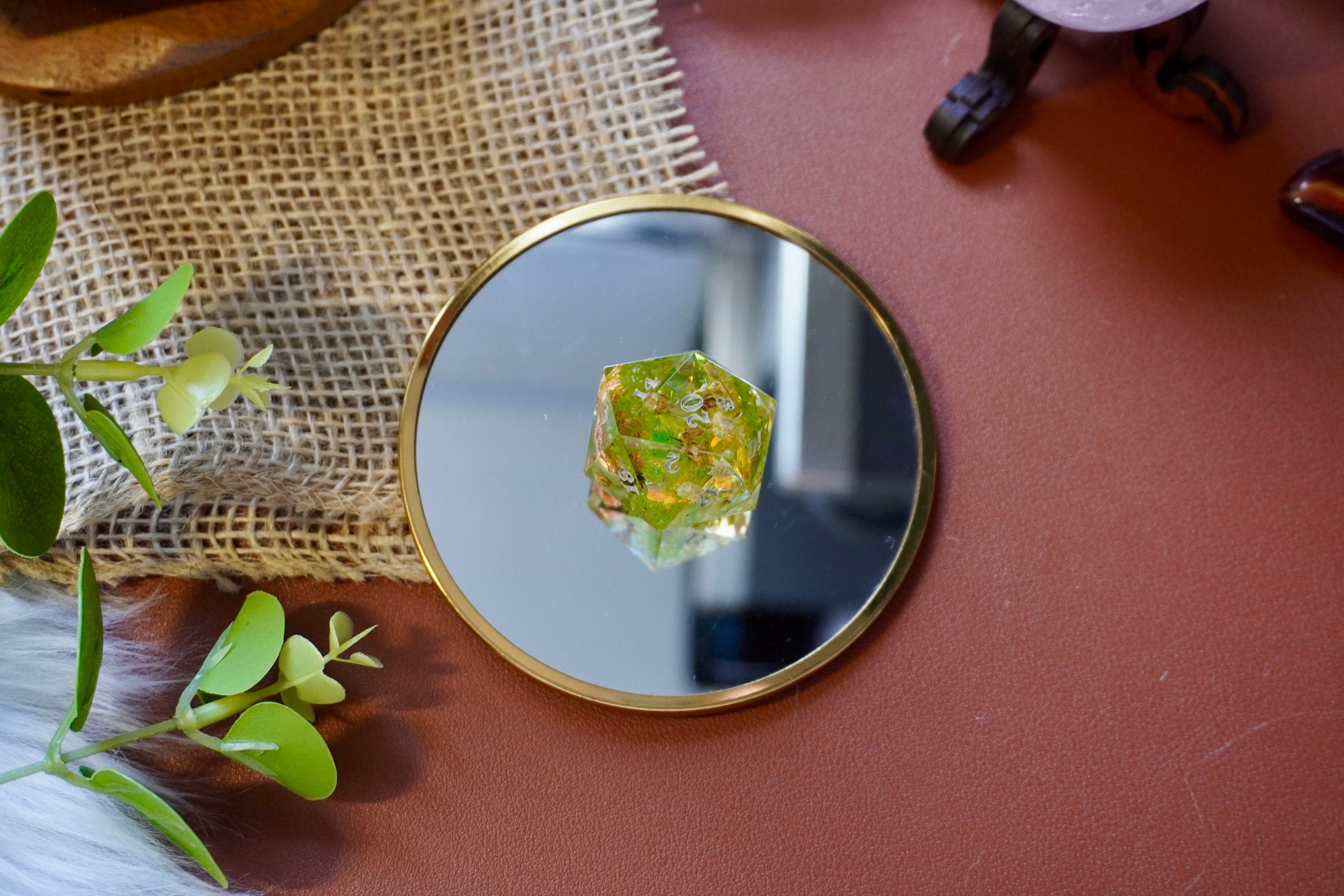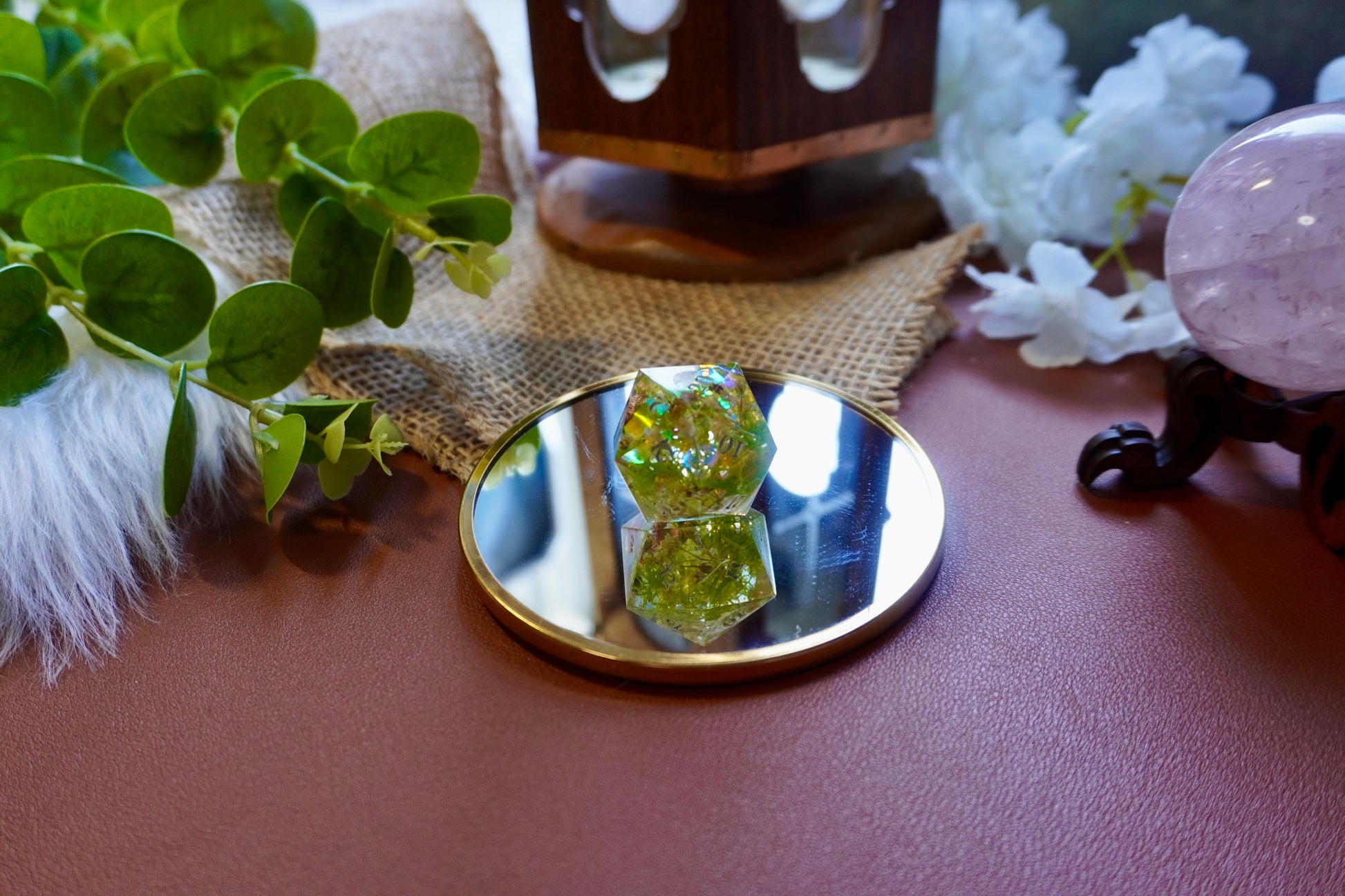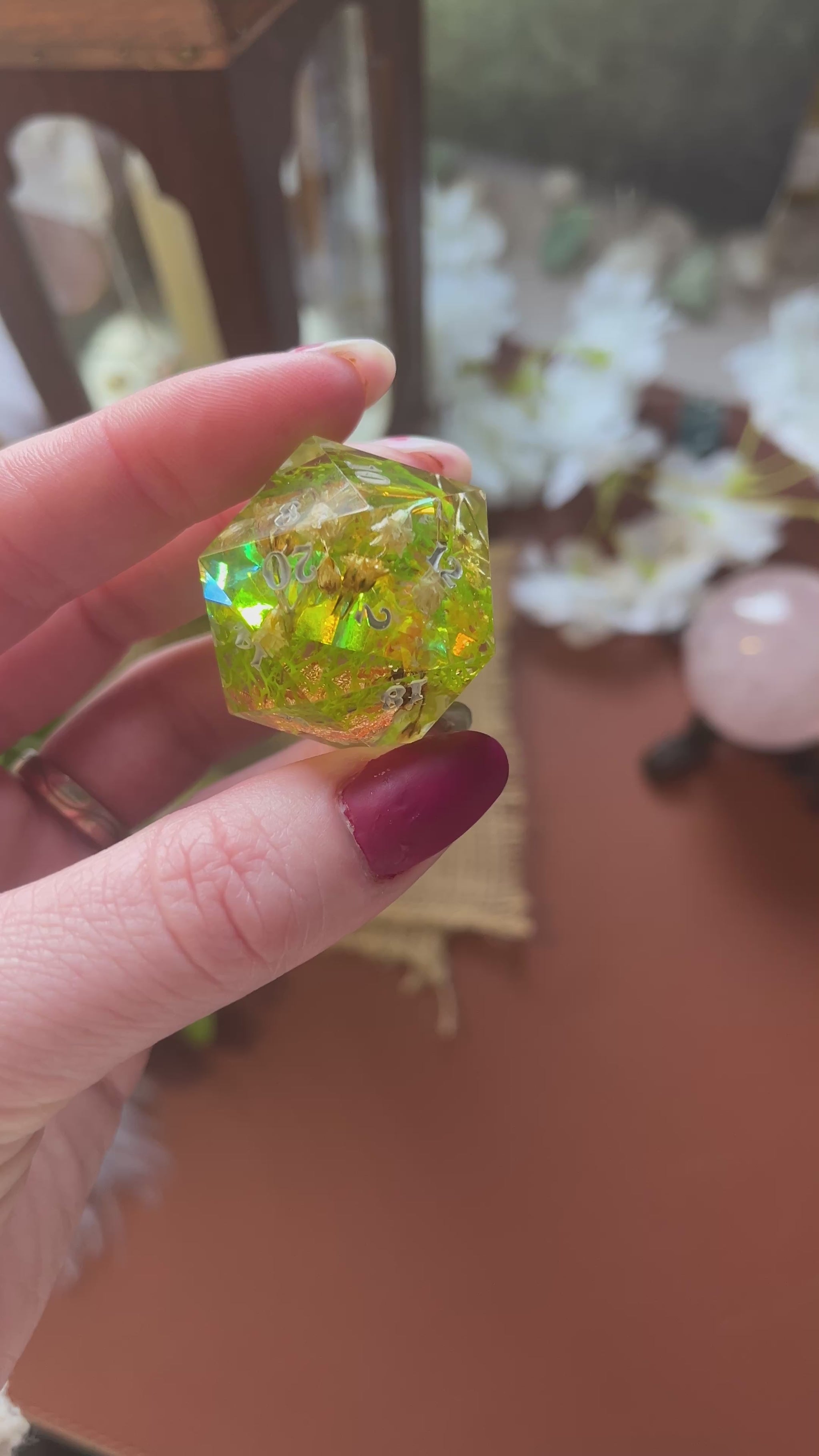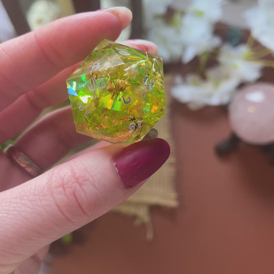 Deze prachtige, handgemaakte dobbelsteen is perfect voor liefhebbers van tabletop RPG’s, bordspellen en verzamelaars. Elk stuk is zorgvuldig gegoten, geschuurd en gepolijst voor een unieke en hoogwaardige afwerking. Gemaakt van hoogwaardig hars, iridescent folie, mos en gedroogde bloemen.