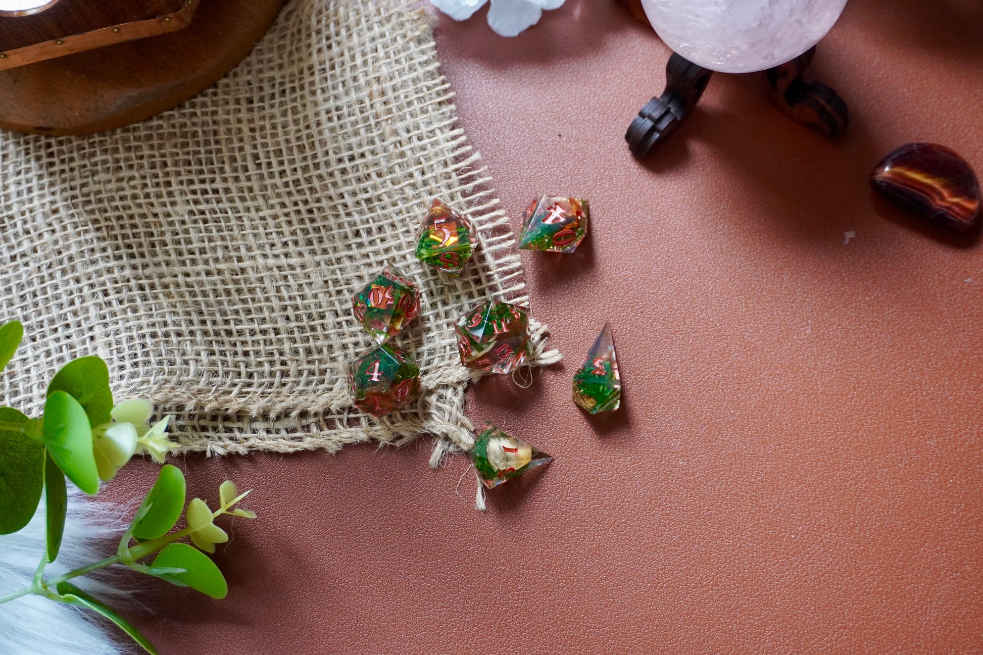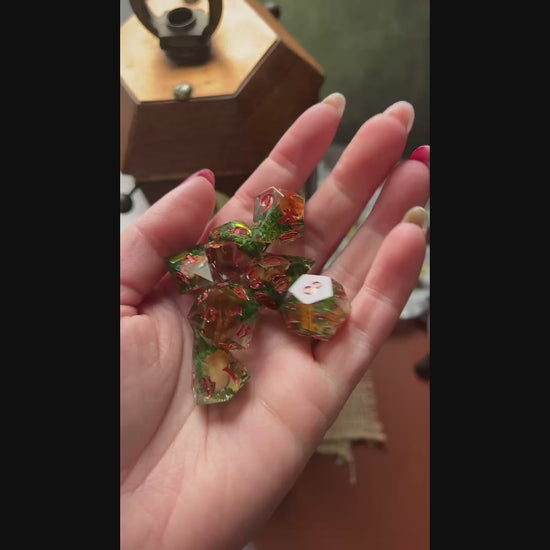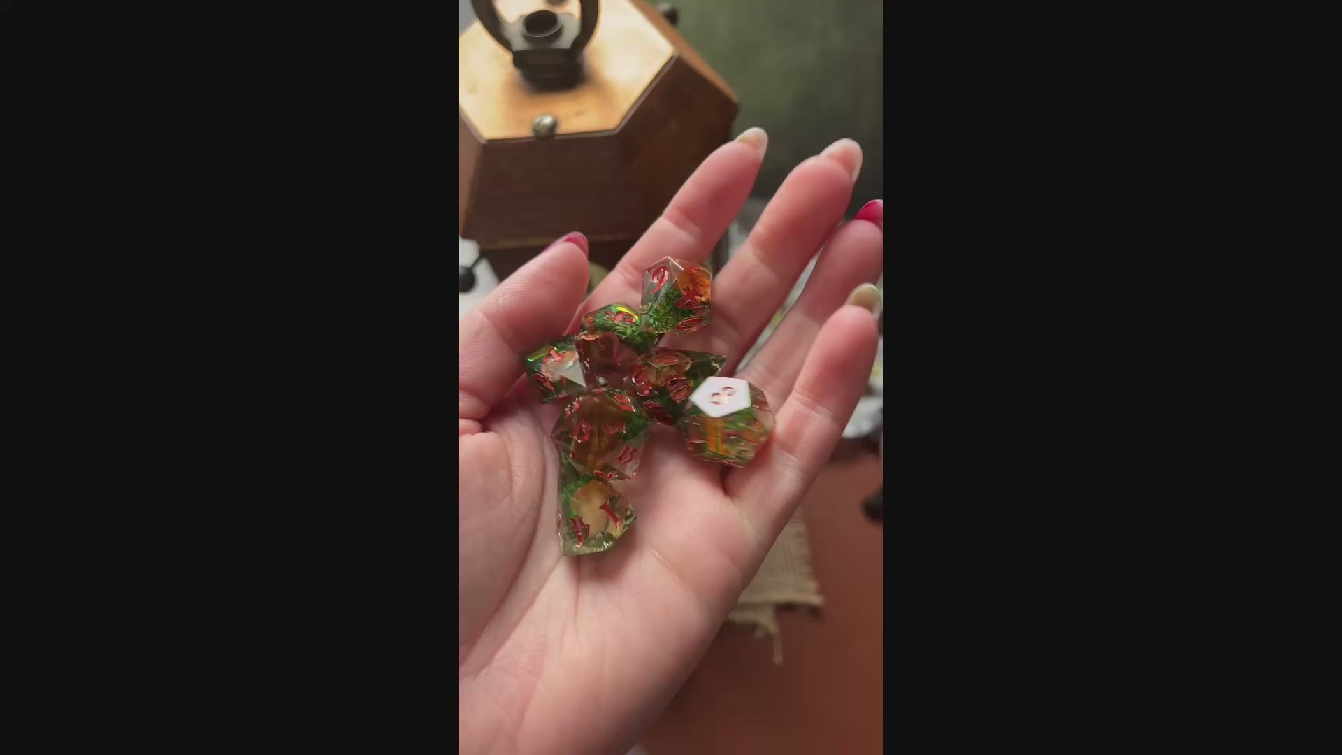 Deze prachtige, handgemaakte dobbelstenen zijn perfect voor liefhebbers van tabletop RPG’s, bordspellen en verzamelaars. Hij is zorgvuldig gegoten, geschuurd en gepolijst voor een unieke en hoogwaardige afwerking. Gemaakt van hoogwaardig hars, mos, zelf gezochte elven bankjes (paddenstoelen) en iridescent folie.