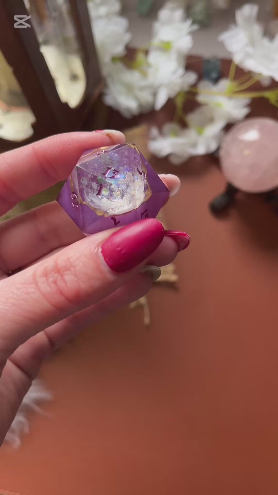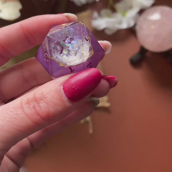 Deze prachtige, handgemaakte dobbelsteen is perfect voor liefhebbers van tabletop RPG’s, bordspellen en verzamelaars. Elk stuk is zorgvuldig gegoten, geschuurd en gepolijst voor een unieke en hoogwaardige afwerking. Gemaakt van hoogwaardig hars, ink en glitters. De binnenste dobbelsteen is uit gehold zodat het een geode effect creëert.