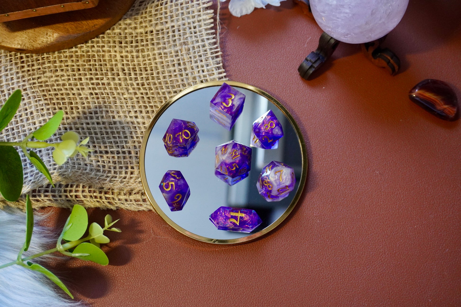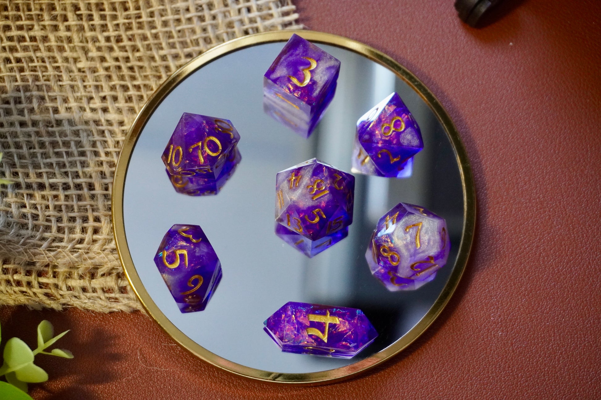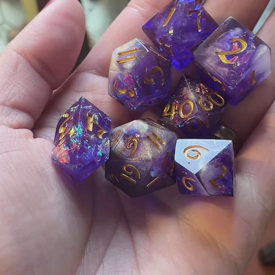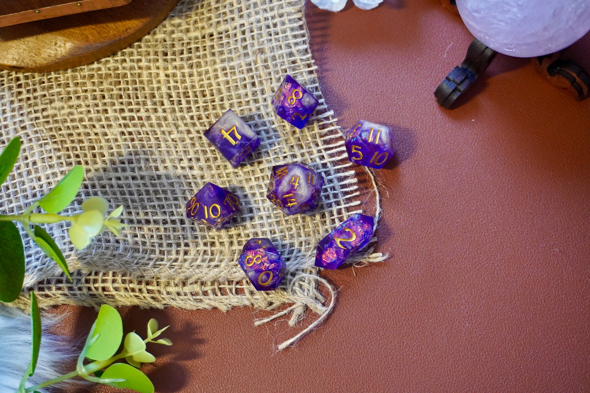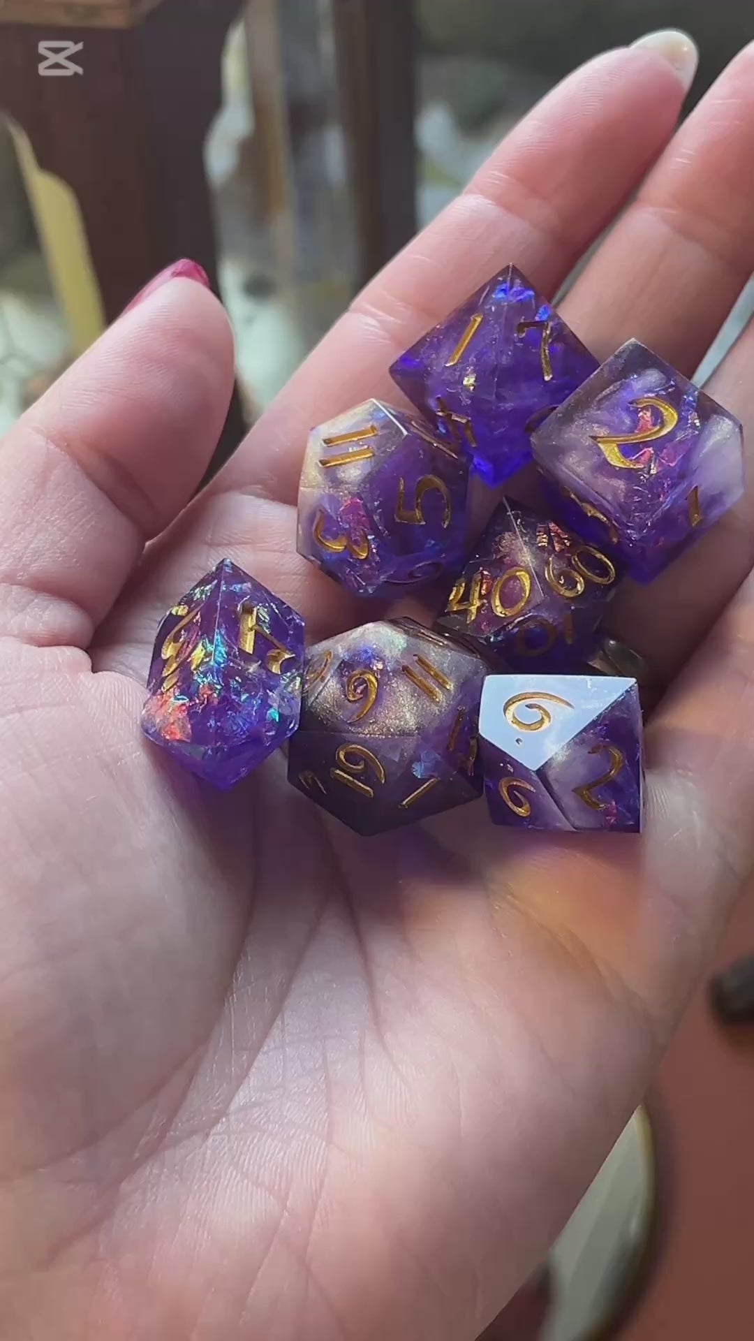 Deze prachtige, handgemaakte dobbelstenen zijn perfect voor liefhebbers van tabletop RPG’s, bordspellen en verzamelaars. Elk stuk is zorgvuldig gegoten, geschuurd en gepolijst voor een unieke en hoogwaardige afwerking. Gemaakt van hoogwaardig hars, iridescent folie, ink en fijne glitters.