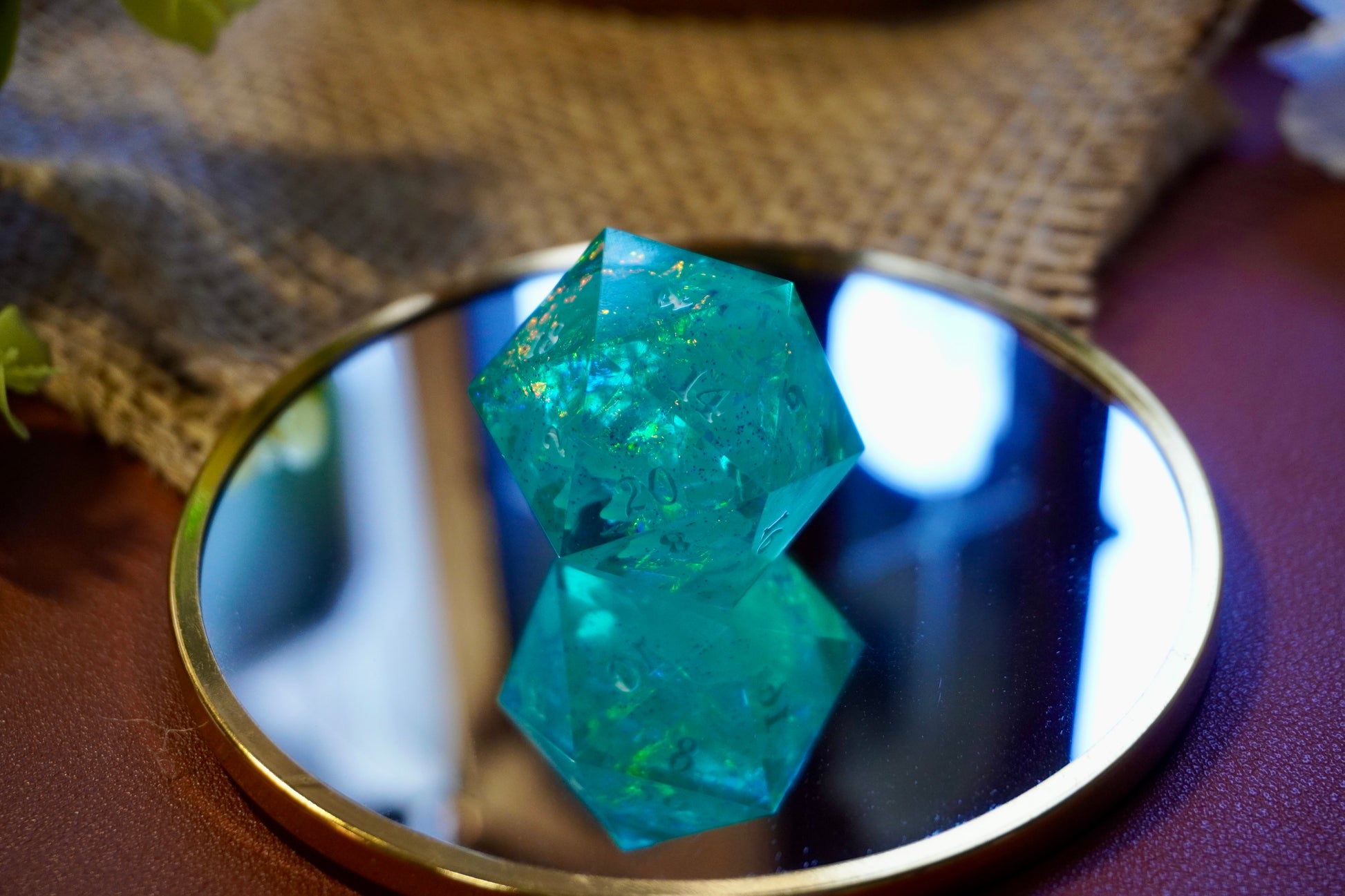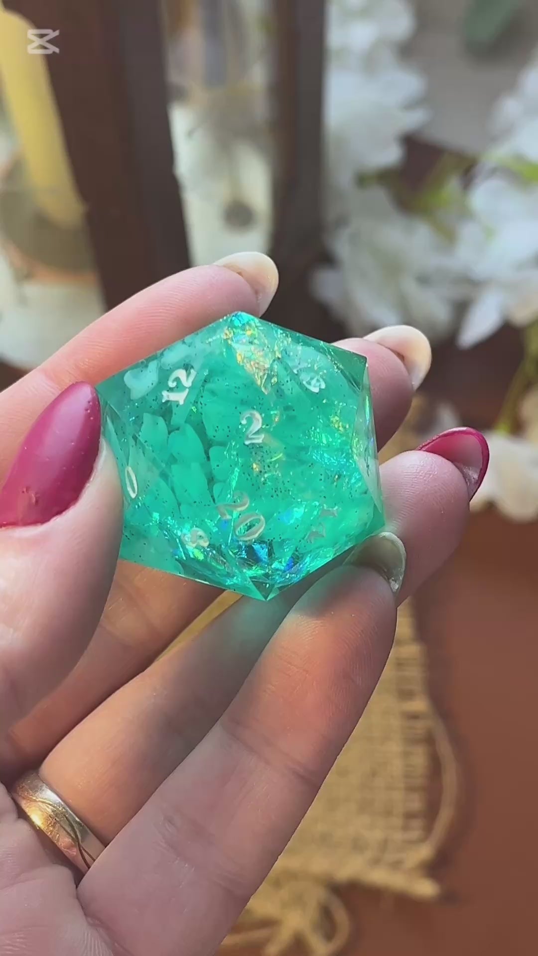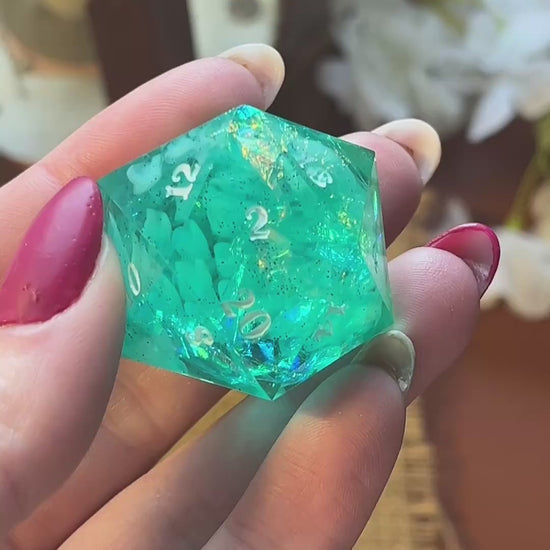 Deze prachtige, handgemaakte dobbelsteen is perfect voor liefhebbers van tabletop RPG’s, bordspellen en verzamelaars. Elk stuk is zorgvuldig gegoten, geschuurd en gepolijst voor een unieke en hoogwaardige afwerking. Gemaakt van hoogwaardig hars, fijne glitters, ink en iridescent folie.