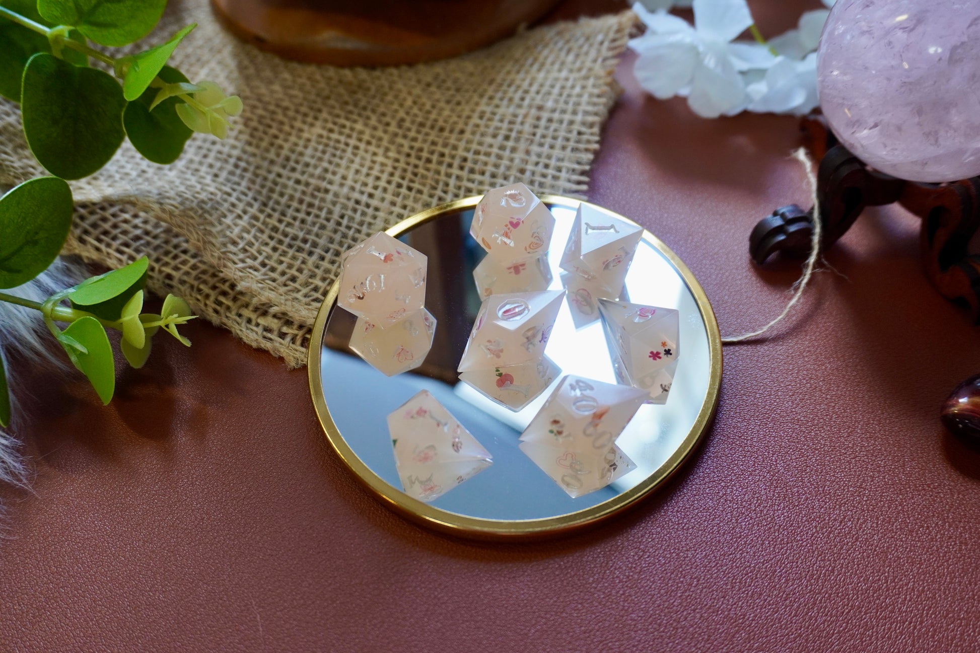 Deze prachtige, handgemaakte dobbelstenen is perfect voor liefhebbers van tabletop RPG’s, bordspellen en verzamelaars. Elk stuk is zorgvuldig gegoten, geschuurd en gepolijst voor een unieke en hoogwaardige afwerking. Gemaakt van hoogwaardig hars, ink en nagel stickers.