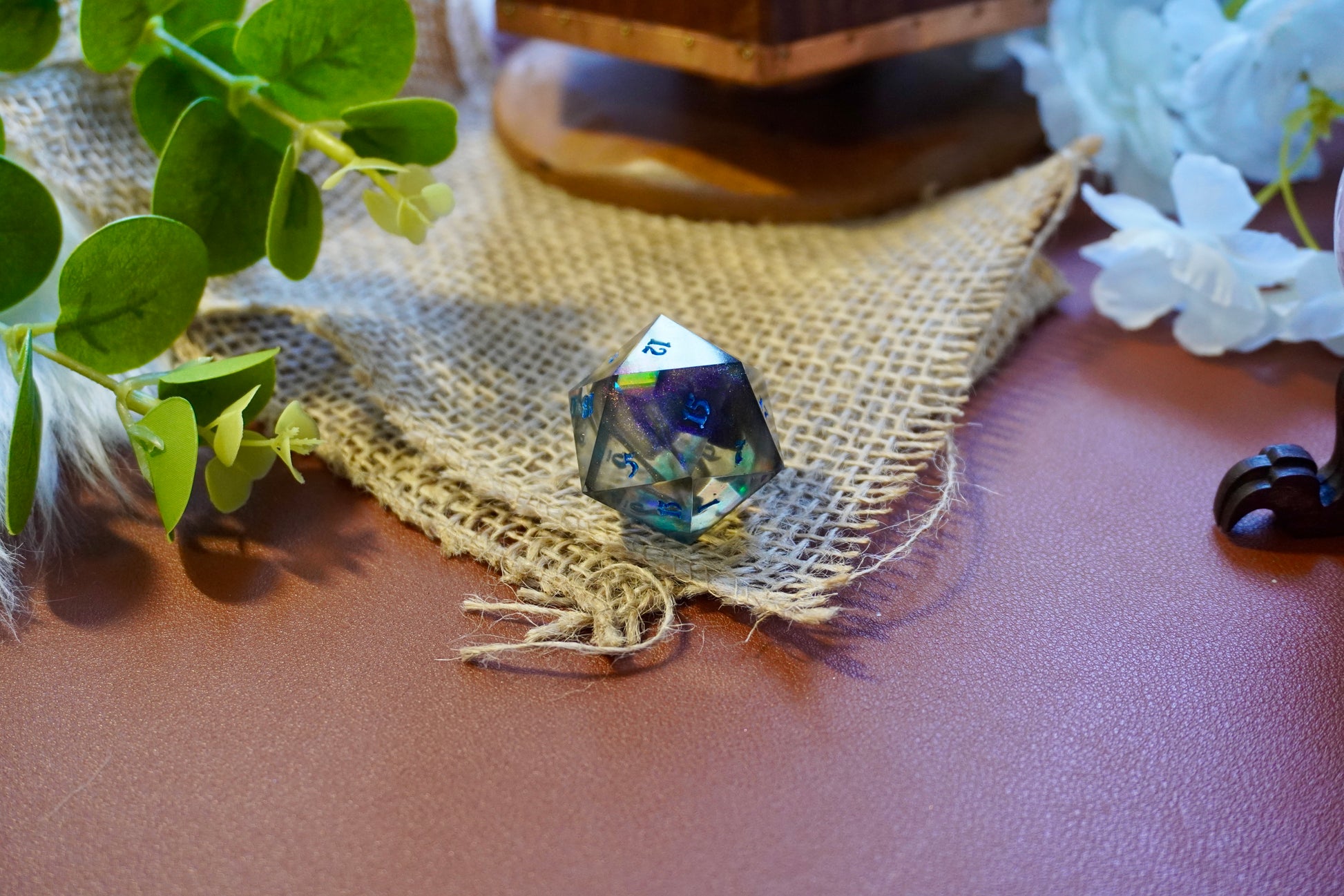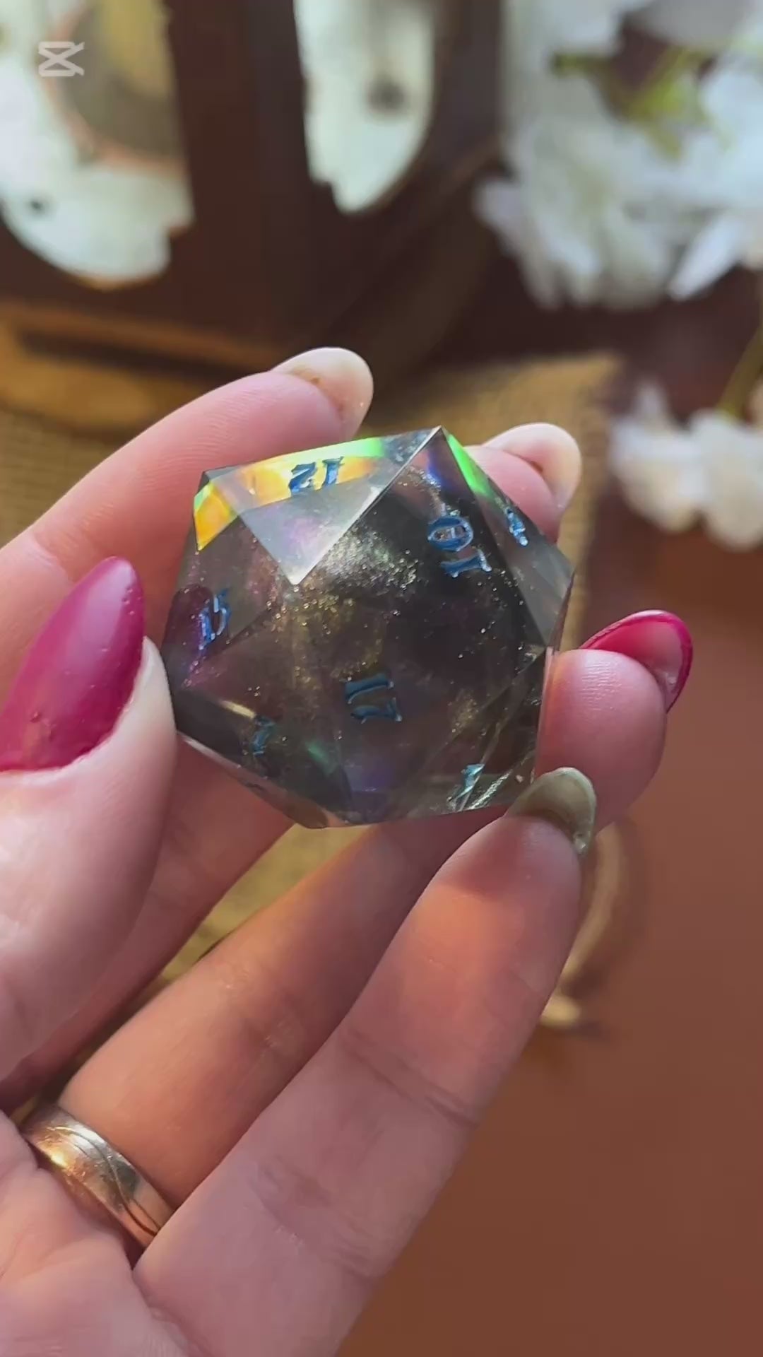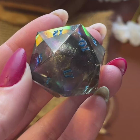 Deze prachtige, handgemaakte dobbelsteen is perfect voor liefhebbers van tabletop RPG’s, bordspellen en verzamelaars. Elk stuk is zorgvuldig gegoten, geschuurd en gepolijst voor een unieke en hoogwaardige afwerking. Gemaakt van hoogwaardig hars, fijne glitters, ink en iridescent folie.