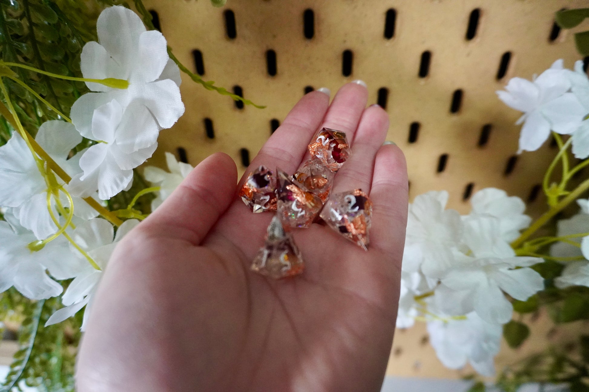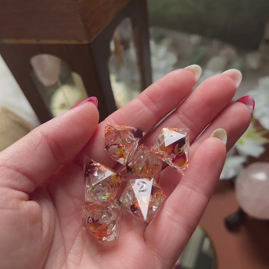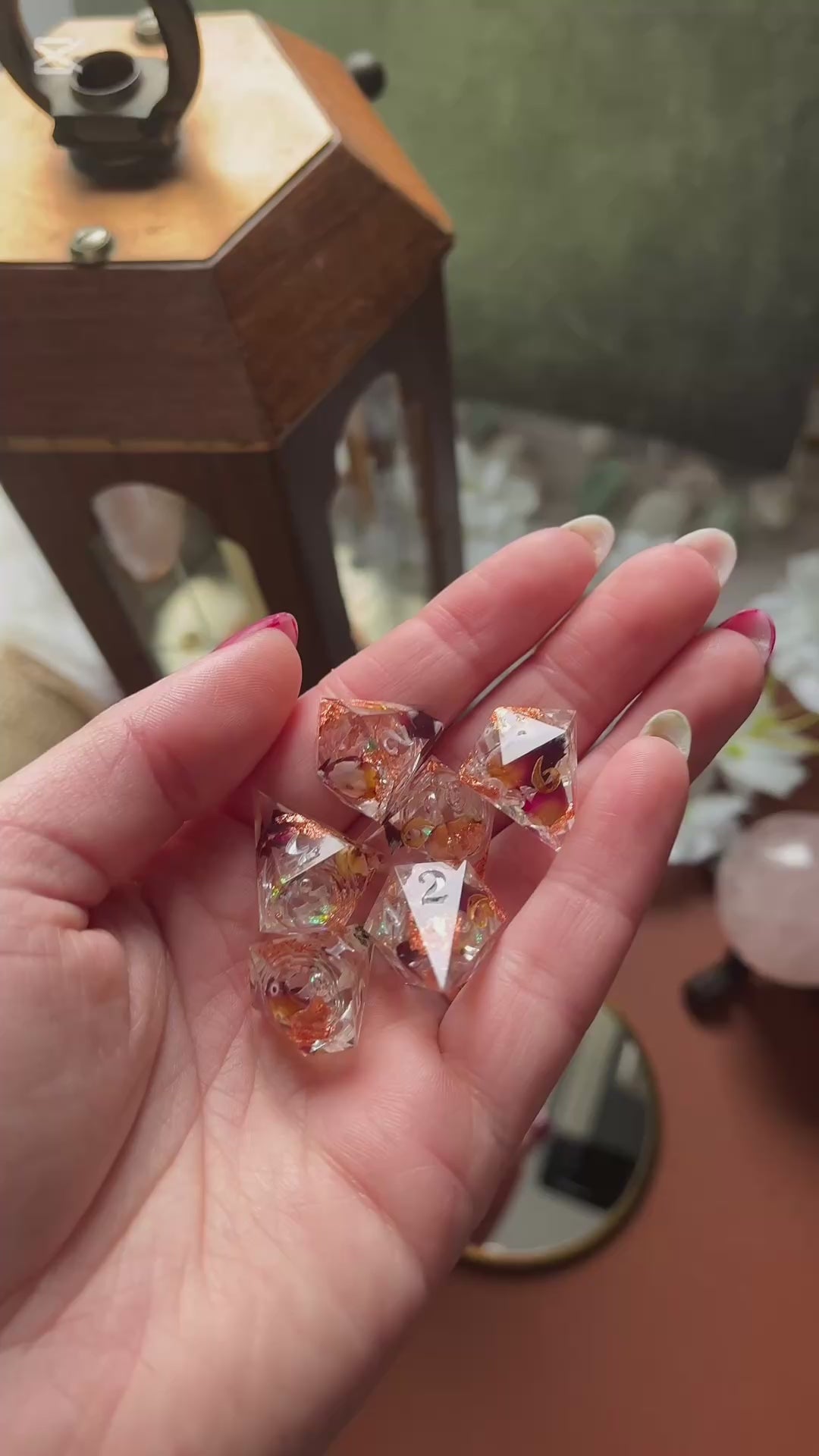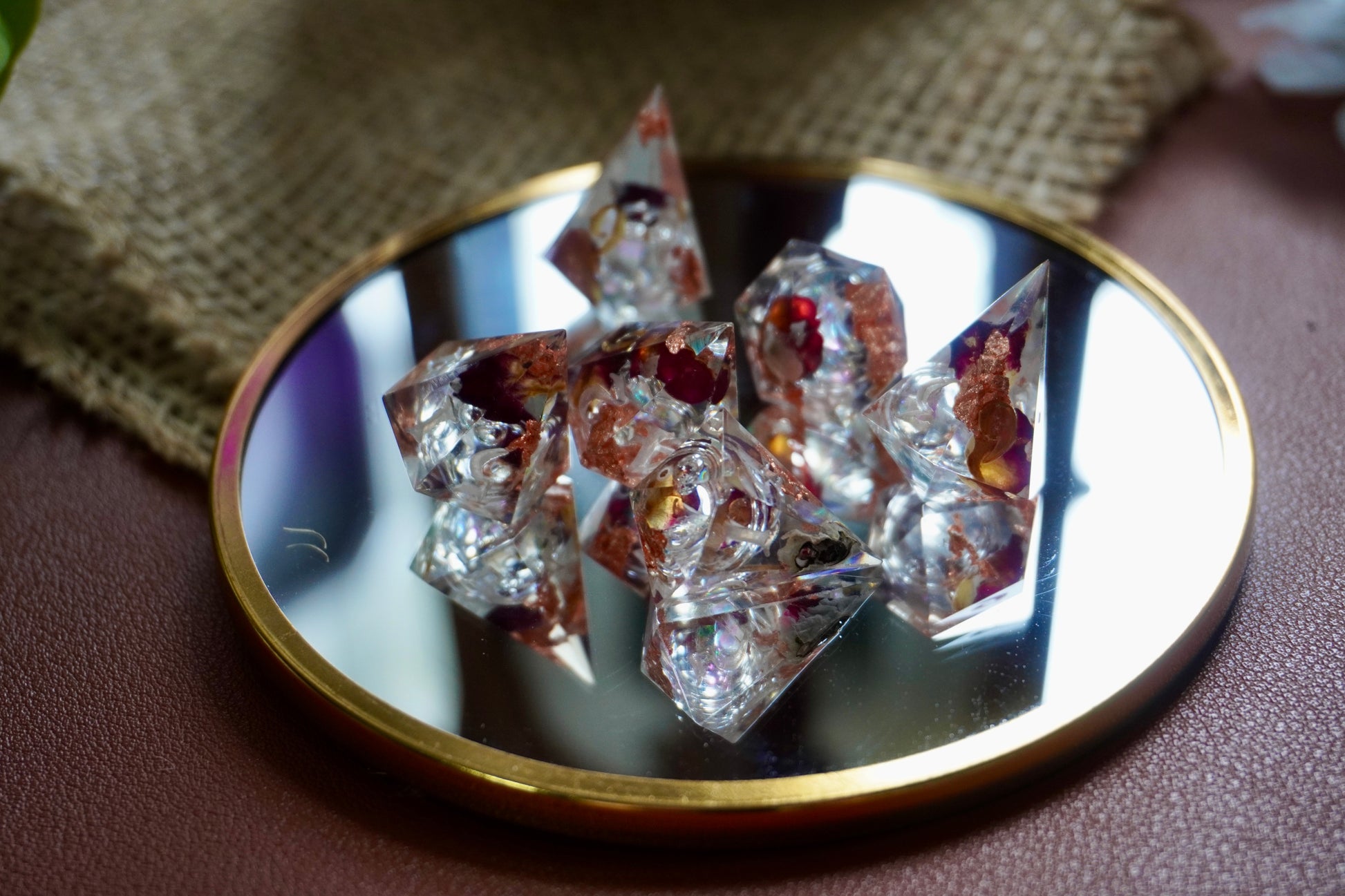 Deze prachtige, handgemaakte dobbelstenen zijn perfect voor liefhebbers van tabletop RPG’s, bordspellen en verzamelaars. Elk stuk is zorgvuldig gegoten, geschuurd en gepolijst voor een unieke en hoogwaardige afwerking. Gemaakt van hoogwaardig hars, iridescent folie, ink en gedroogde rozen blaadjes.