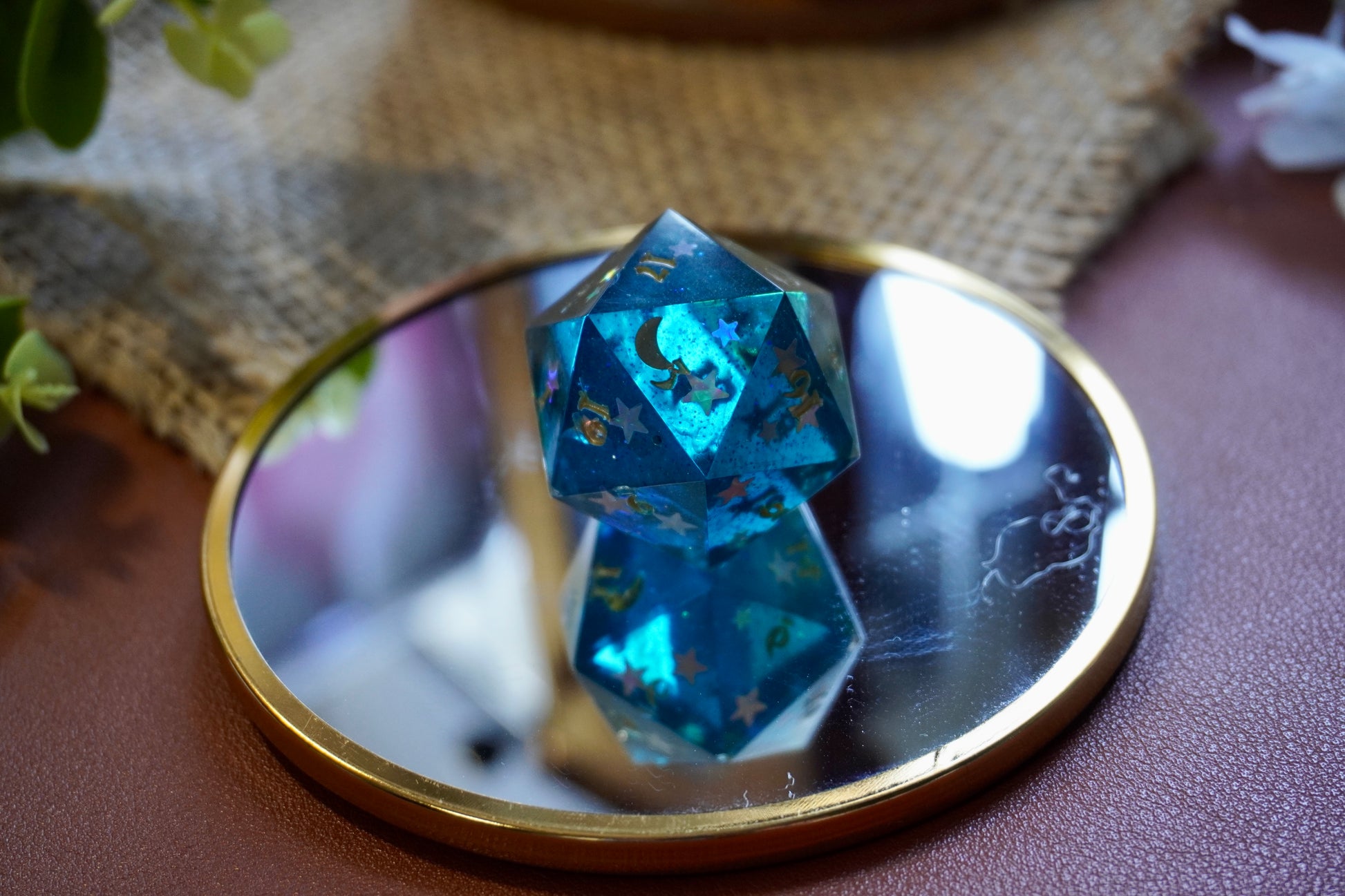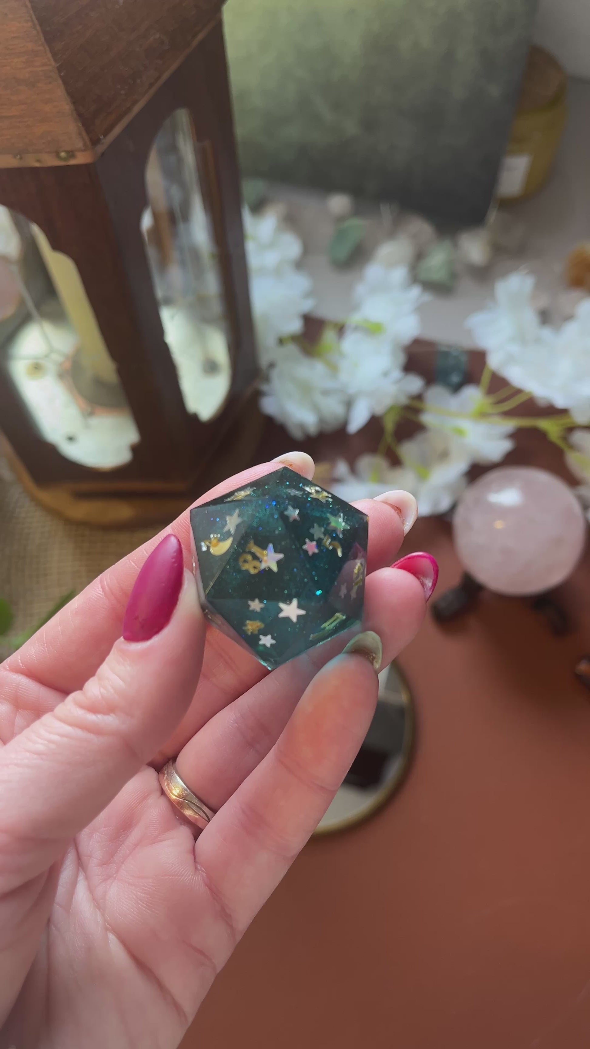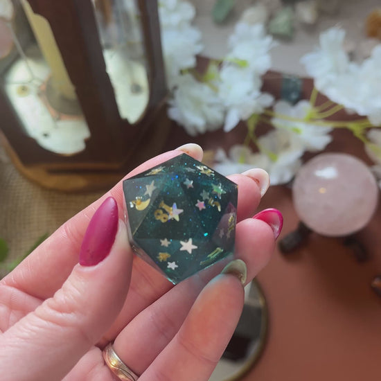 Deze prachtige, handgemaakte dobbelsteen is perfect voor liefhebbers van tabletop RPG’s, bordspellen en verzamelaars. Elk stuk is zorgvuldig gegoten, geschuurd en gepolijst voor een unieke en hoogwaardige afwerking. Gemaakt van hoogwaardig hars, ink en holografic glitters.